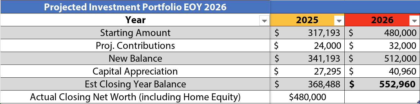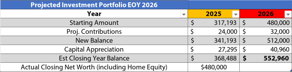 In my last post I set a net worth estimate for the end of 2025 at $480k 8. My mortgage is now paid up until March 1, 2026 (2 payments of about ~$2900 Jan and February) so it looks like my cash balance has come down a lot. I noticed these prepayments aren’t reflected on my oustanding balance yet. I like having a little buffer. Starting next month I’m going to start with the triple principal payments (2 more than normal month) scenario I mentioned in my last post.